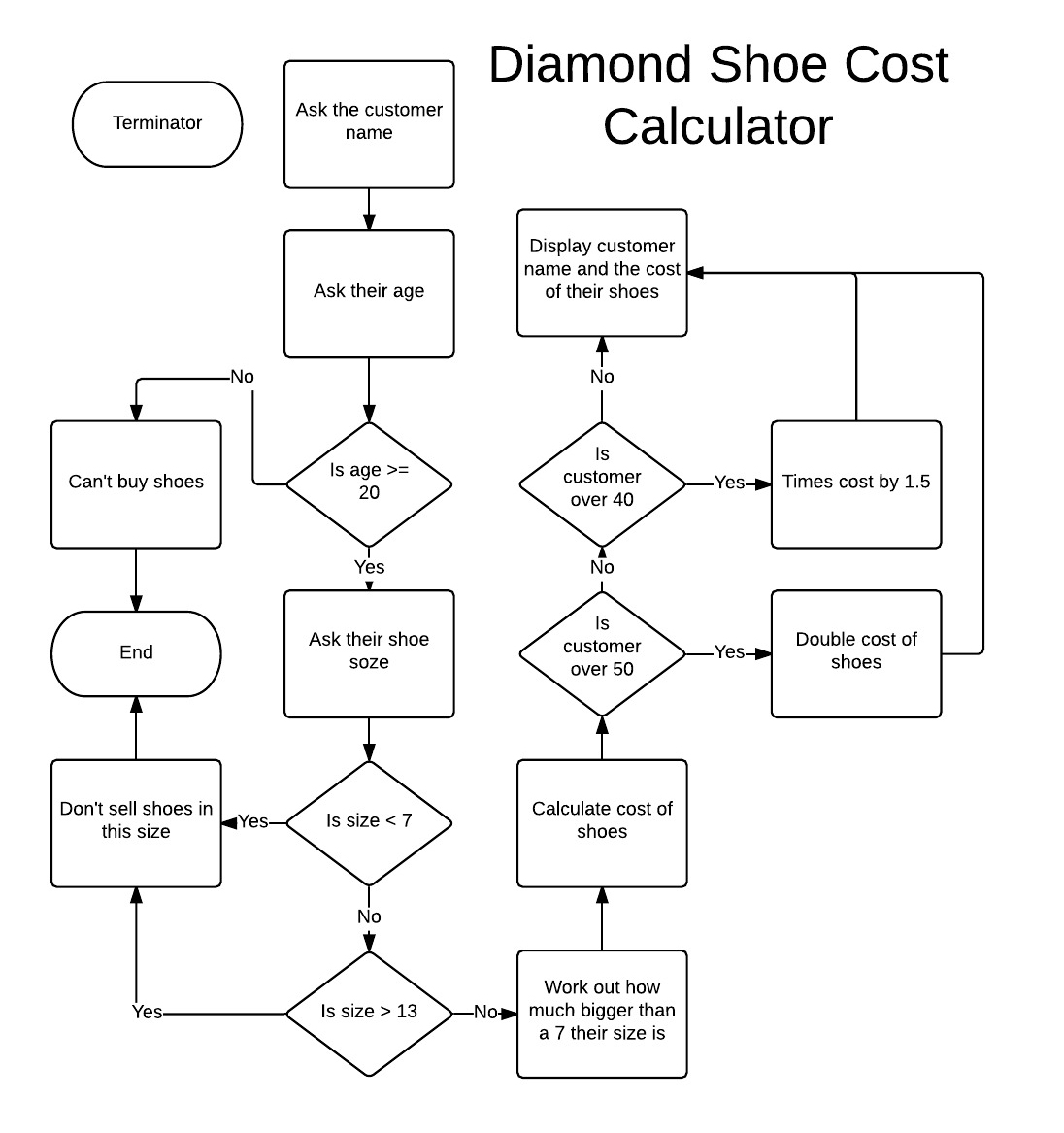 Shoe Cost CalculatorYou are creating a program for a new company, Diamond Geezer Shoes, which sells hand made trainers which are encrusted with diamonds. They are aiming to make this an expensive high fashion choice, which means that they have very specific ideas on who they would like to market their shoes to. The shoes come in sizes from 7 to 13, and have a basic cost of £1000 per pair. The number of diamonds needed obviously depends on the size of the shoe, so there is an additional cost of £200 for every shoe size over 7. So for example a pair of shoes in size 10 will cost £1000 + £200 * 3 (the difference between 10 and 7), = £1000 + £600 = £1600. The idea is to associate the diamond shoes with self-made wealthy people aged between 25 and 40. They don't want people without their own independent wealth to wear them, so they won't sell them to people under 20, as these people aren't old enough to have made their own money, and are probably getting them as a gift. They will grudgingly sell them to the over 40s, but the price goes up by a sliding scale of 1.5 * the cost for the 40-50 age group, or double the cost if over 50. So for example, the size 10 pair of shoes for someone aged 20 to 40 is £1600. Someone aged 19 can't buy them. Someone aged between 41 and 50 pays 1.5 * £1600 = £2400. Someone aged 51 or over pages 2 * £1600 = £3200. In summary: