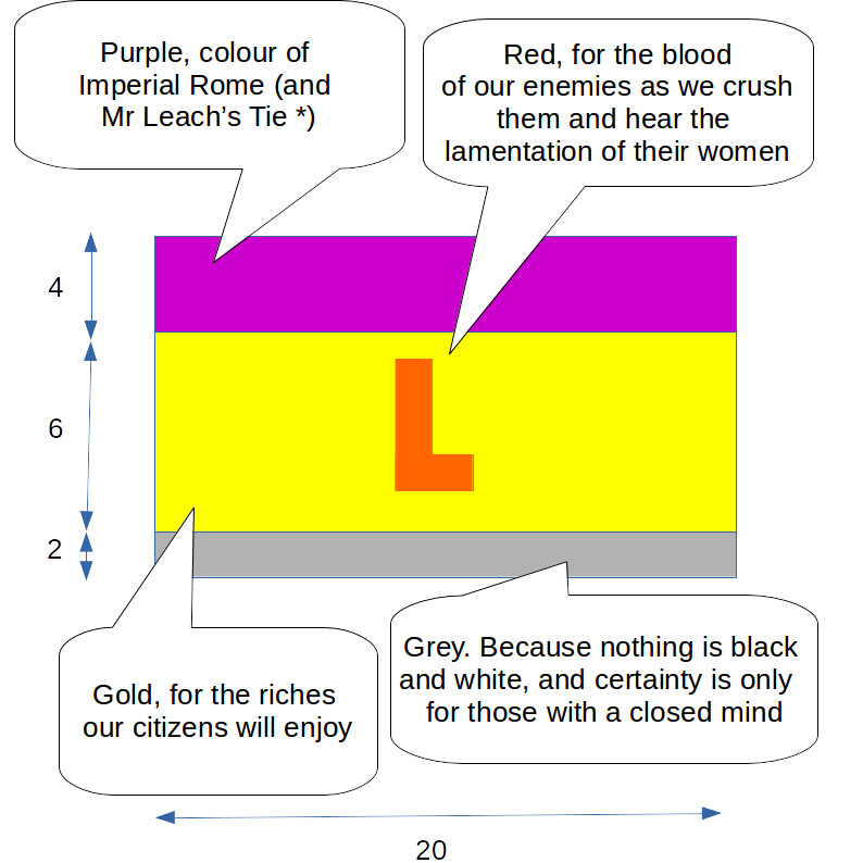 These are your instructions, minion, and you'd better do a good job because you know our Leader doesn't handle disappointment well..... Main taskCopy the example code and adapt it to produce the design of the flag. You will need to find the Hex values of some suitable colours. First extensionOften when a colour logo is photocopied in black and white, it doesn't look at all good. For that reason, most organisations will have two versions of their logo, one that looks good in colour and another which works well in shades of grey.