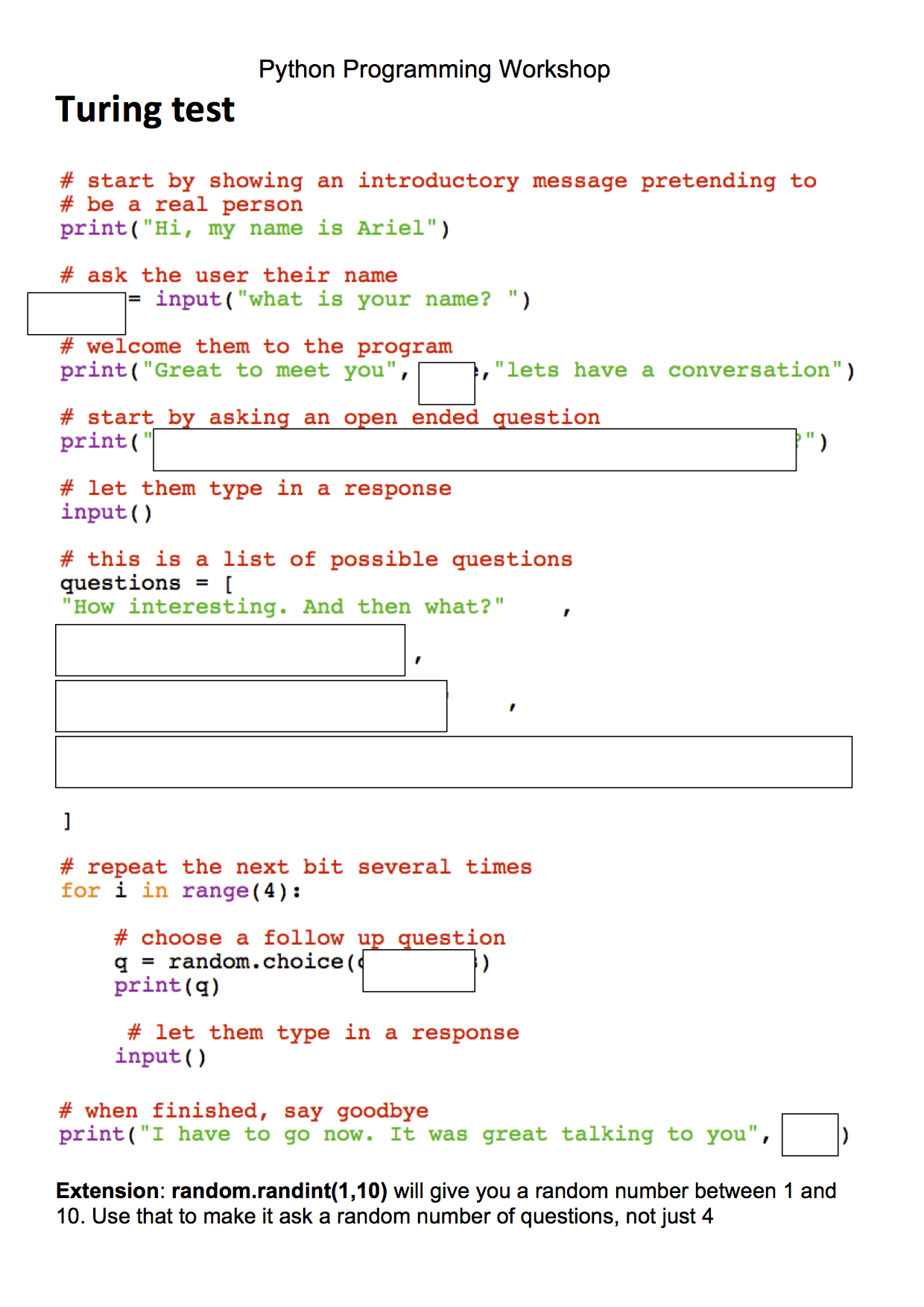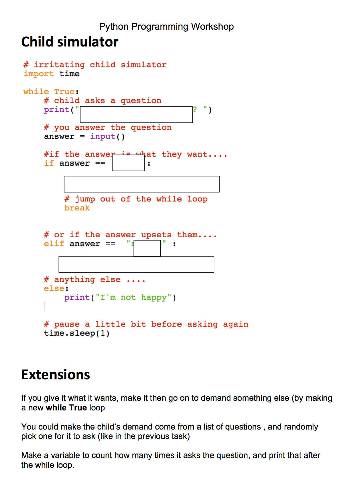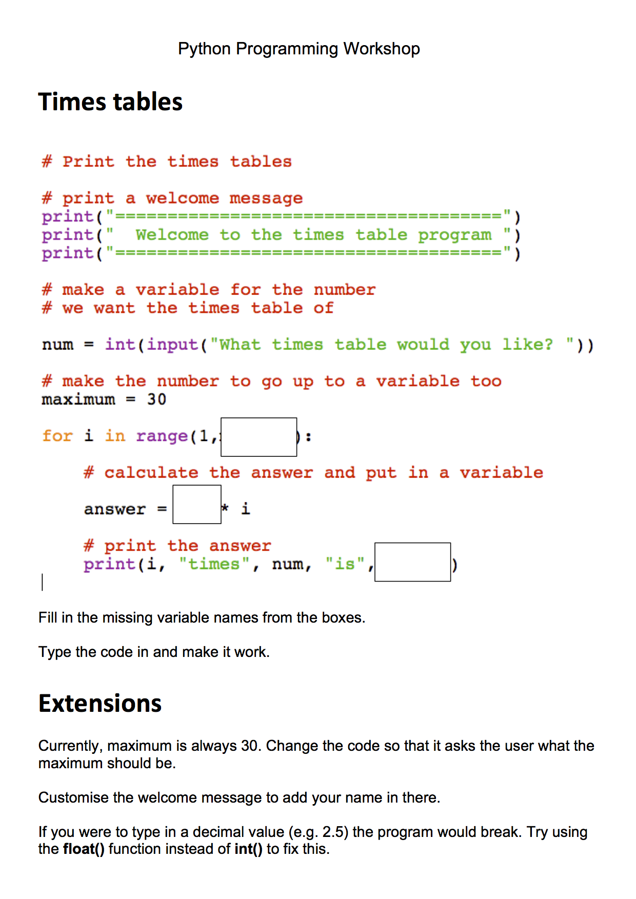 This is the section with the material for my one day "Introduction to Python" course, which is aimed at year 7/8/9 pupils. The pages here contain the source code for the demonstrations to the pupils and also the worksheets for them. This will probably be most use to teachers who have seen me give the course and want to reproduce it for their own pupils, but if you find it useful, please feel free to use the materials here to teach your own students. The basic format is that there is a demonstration of the code, gradually building it up in stages and discussing the concepts as they are used. The there is a worksheet where the pupils nave to fill in some blanks (e.g. variable names, output messages) before using the worksheet to type in the code themselves. There are some extension suggestions for those who complete it quickly.